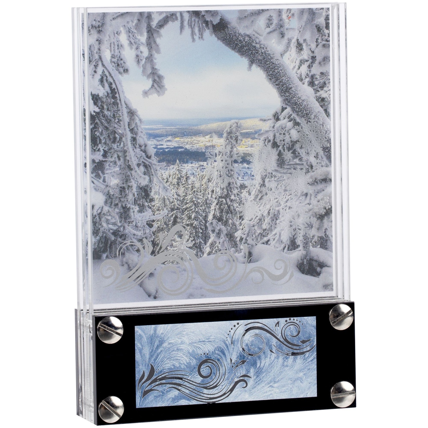 Придать награде законченный вид поможет шильд с гравировкой на основании.Трехслойная награда из акрила с креплением на 4 винтах. Толщина прозрачных панелей - 4 мм.